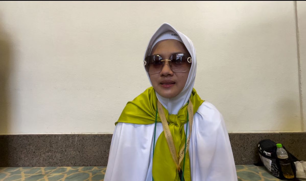 Selesai berdoa, ia mengulurkan tangan kepada salah satu tim Media Center Haji (MCH) yang juga selesai salat tepat di sampingnya. Mata sembabnya ia coba sembunyikan dengan langsung mengenakan kacamata hitam yang diambil dari dalam tasnya.
