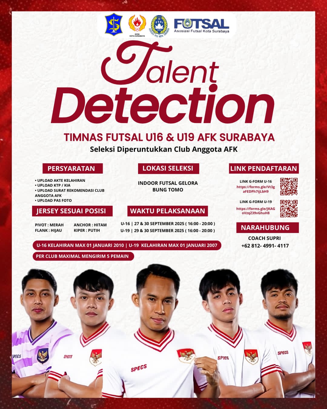Ketua AFK Surabaya, Abdullah Sultan mengatakan Talent Detectiin adalah agenda pencarian talent futsal dari seluruh Indonesia secara berjenjang yang diawali dari tingkat Federasi Futsal Kabupaten/Kota, dilanjutkan Seleksi dilanjutkan tingkat federasi propinsi dan finalisasinya akan di tentukan oleh federasi pusat untuk akhirnya menjadi tim futsal nasional (Tinmas) Untuk Usia 16 (U16) dan Usia 19 Tahun (U19). Dalam pelaksanaannya, AFK Surabaya menunjuk Yobel Edi Waluyo sebagai ketua kordinator Talent Detection, dengan kordinator Seleksi oleh Coach Ambar Supriato. “Keduanya sosok yang pas menangani program Talent Detiction Timnas U16 & U19, dedikasinya untuk futsal surabaya tidak diragukan lagi,” tambah Abdullah.