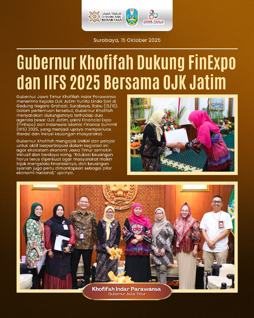 Hal tersebut disampaikan Gubernur Khofifah saat menerima audiensi Kepala OJK Provinsi Jawa Timur Yunita Linda Sari beserta jajaran di Gedung Negara Grahadi, Surabaya, Rabu (15/10).
