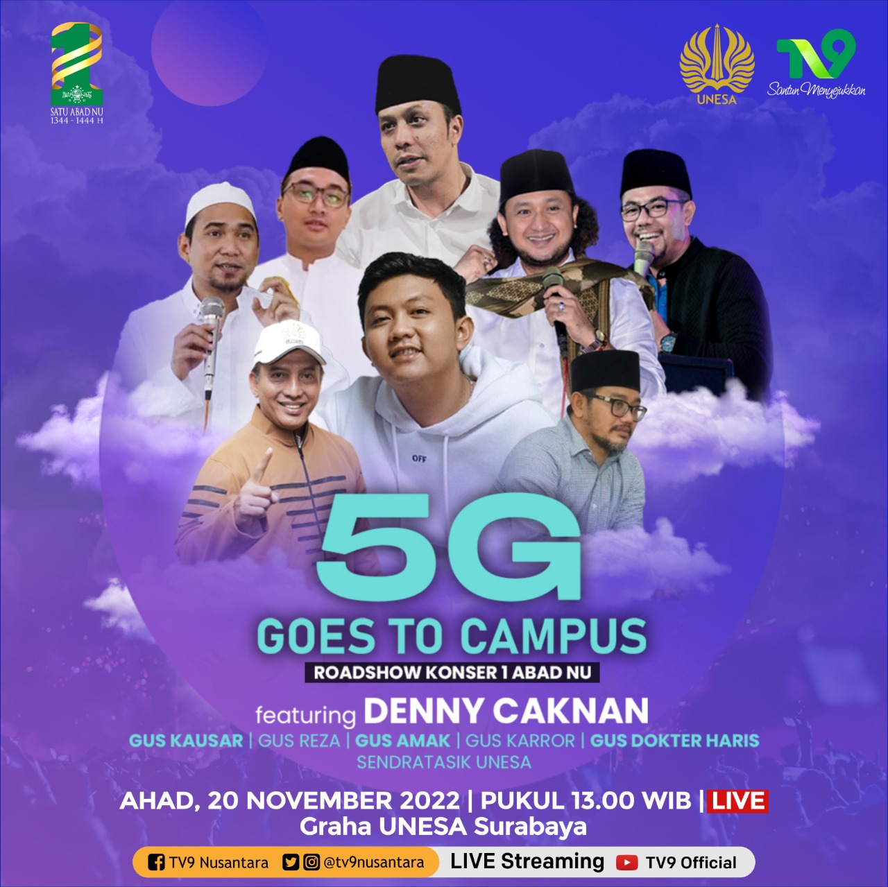 Surabaya, Jurnal9.tv – Konser 5G (5 Gus) Goes To Campus, siang ini di Graha Unesa bakal meriah penuh kejutan. Bukan hanya karena lagu-lagu galau dari Denny Cak Nan, tapi juga tampilan para gus gaul seperti Gus Haris Genggong yang akan perform lagu hits ‘widodari’ dengan iringan Kiki Band. Gus Kautsar, ‘Gus Baha dari Ploso’ akan ngobrol pintar perlunya Teladan di era budaya populer. Rektor Unesa, Prof Nur Hasan bawakan dua lagu: Klebus dan Ojo Nangis. Seru!