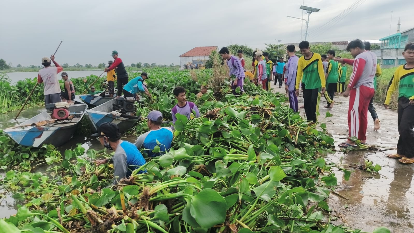 mereka bahu-membahu terjun ke sungai untuk membersihkan hamparan enceng gondok yang menutup akses transportasi warga.