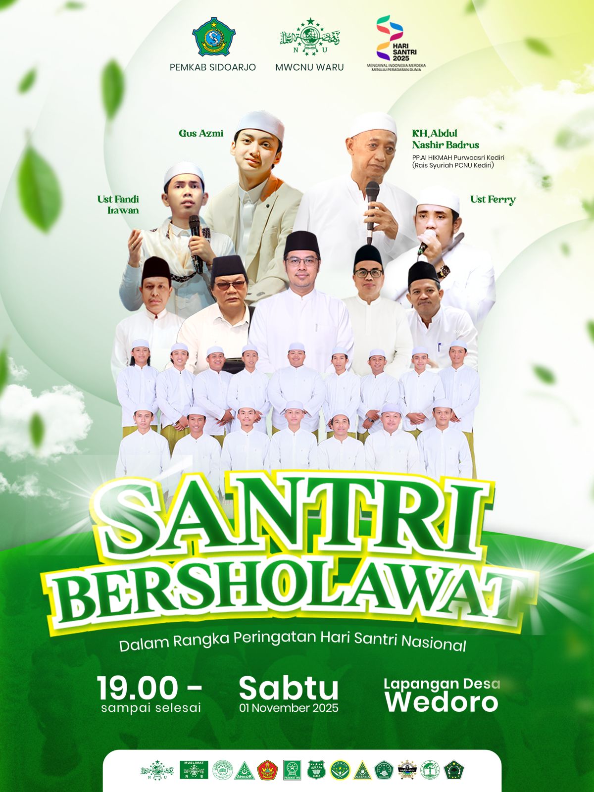 Dan puncaknya, yaitu kegiatan “Santri Bersholawat”. Kegiatan yang akan dilaksanakan pada Sabtu, 1 November 2025, pukul 18.00 Wib, di lapangan Wedoro, Waru Sidoarjo akan menghadirkan Gus Azmi dari Blitar, serta Cak Fandi, Cak Fery. Sementara untuk pencerah agama, KH. Abdul Nasir, salah satu pengasuh ponpes Al-Hikmah Purwoasri sekaligus Rais Syuriah PCNU Kab Kediri.