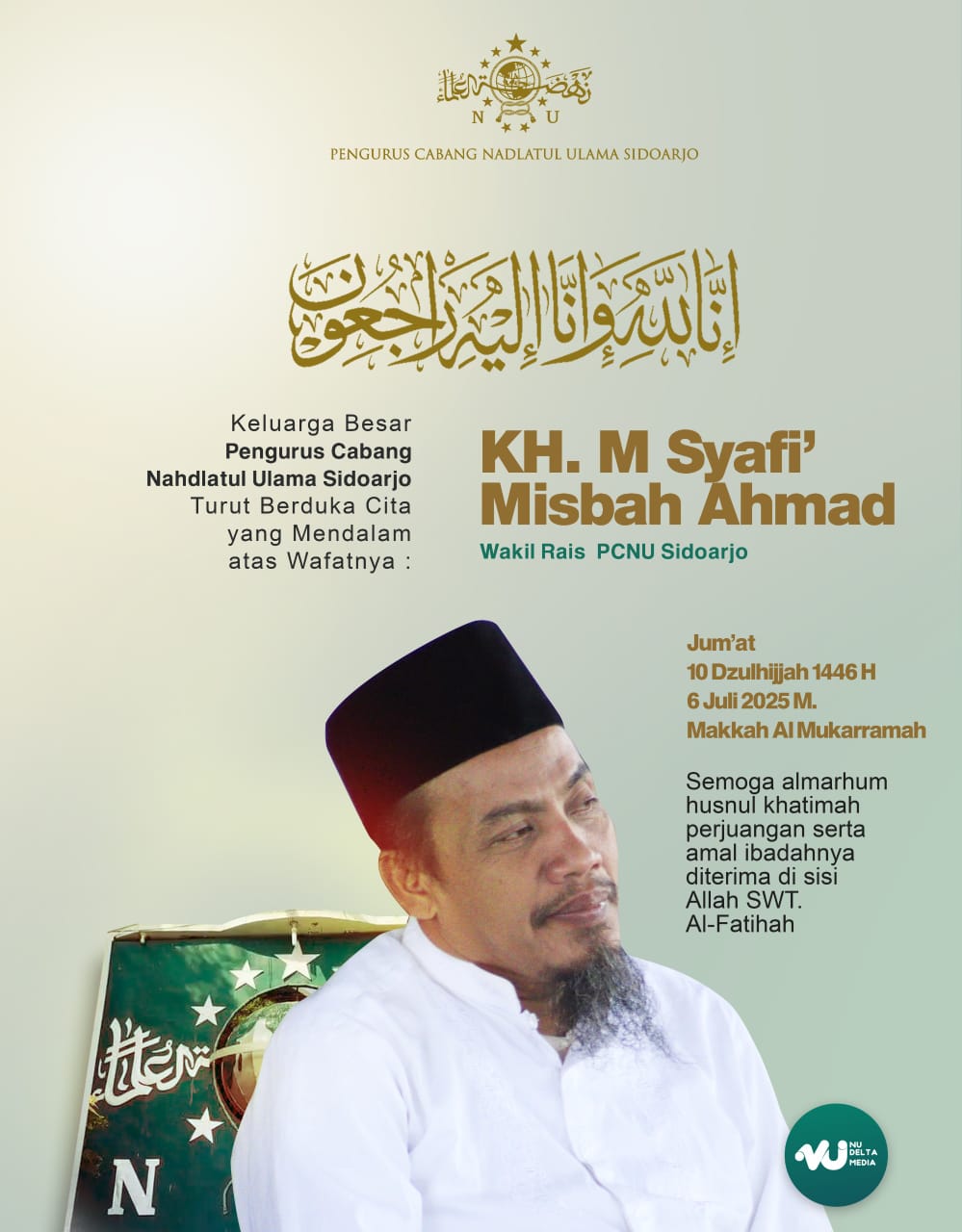 Innalillahi wa inna ilaihi rajiun. KH Syafi Misbah Ahmad, Pengasuh PP Al Hidayah Ketegan, Tanggulangin, Sidoarjo yang juga Wakil Rais Syuriyah PCNU Sidoarjo kembali ke Rahmatullah. Mas Syafi’ kami biasa memanggil, wafat dalam ruh yang suci di tempat dan saat yang suci, diiringi gema talbiyah dan takbir idul adha di hari Jumat, 10 dzulhijjah 1446 H. Almarhum saat itu sedang di medannjuang, memandu jamaah haji melontar jumrah, yang beberapa saat sebelumnya melakukan Wukuf di Arafah. Allahu Akbar.
