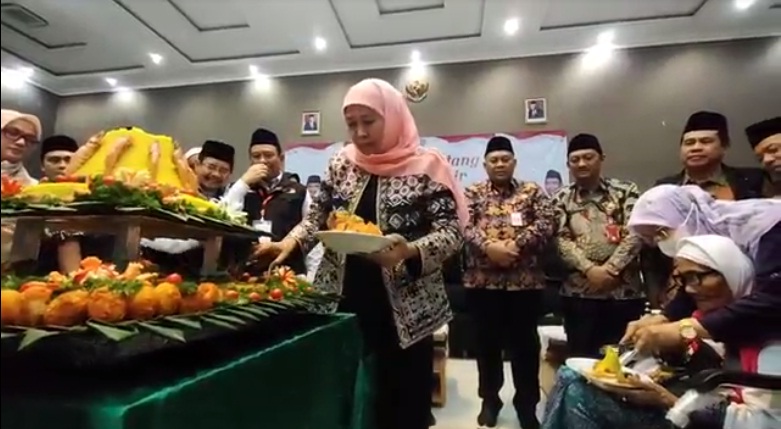Kedatangan jemaah haji gabungan dari sejumlah daerah di Jawa Timur ini, disambut langsung oleh Gubernur Jawa Timur, Khofifah Indar Parawansa. Gubernur memberi kejutan jemaah haji dengan memberi tumpeng, dan memberikan potongan tumpeng pertama kepada jemaah haji tertua berusia 81 tahun asal Gresik.