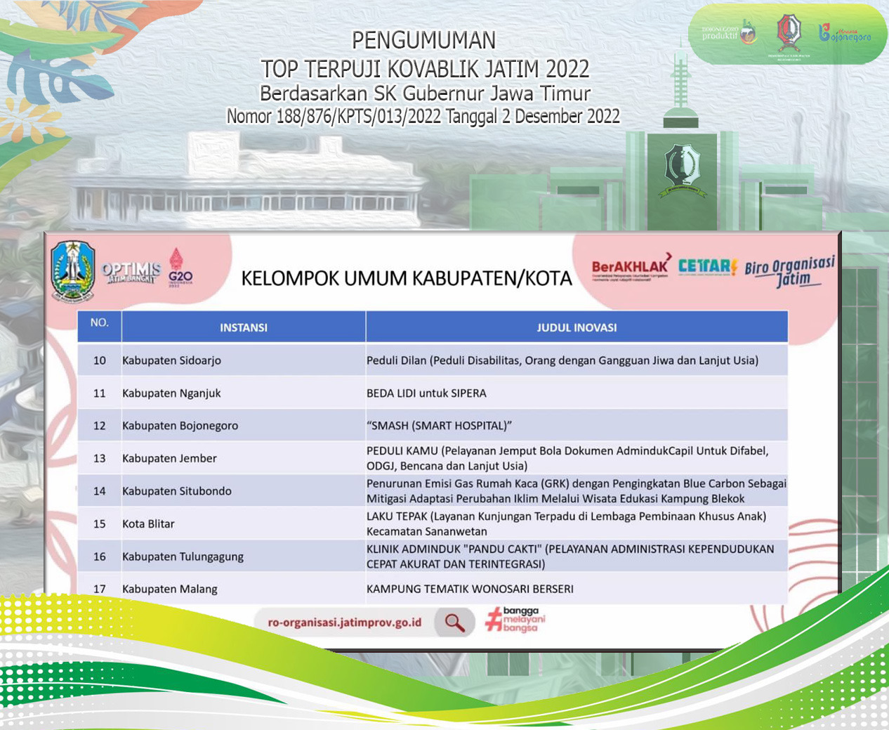 “Alhamdulillah Inovasi SMASH RSUD Sumberrejo masuk dalam 17 TOP Terpuji Kategori Inovasi Umum Daerah di ajang KOVABLIK Jawa Timur Tahun 2022, dari sebelumnya menjadi finalis Top 45 dari 204 inovasi yang lolos tahap administrasi,” jelas dr. Ratih Selasa (6/12/2022).