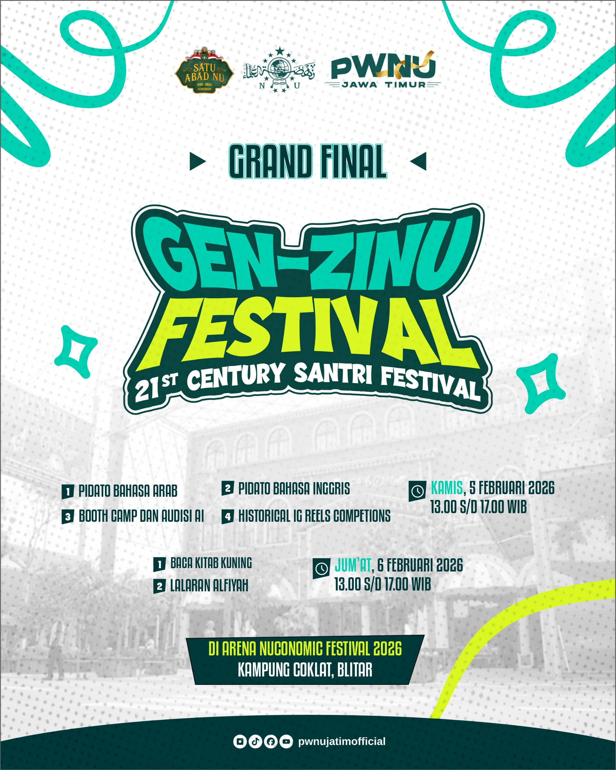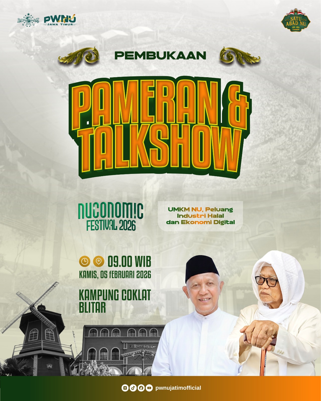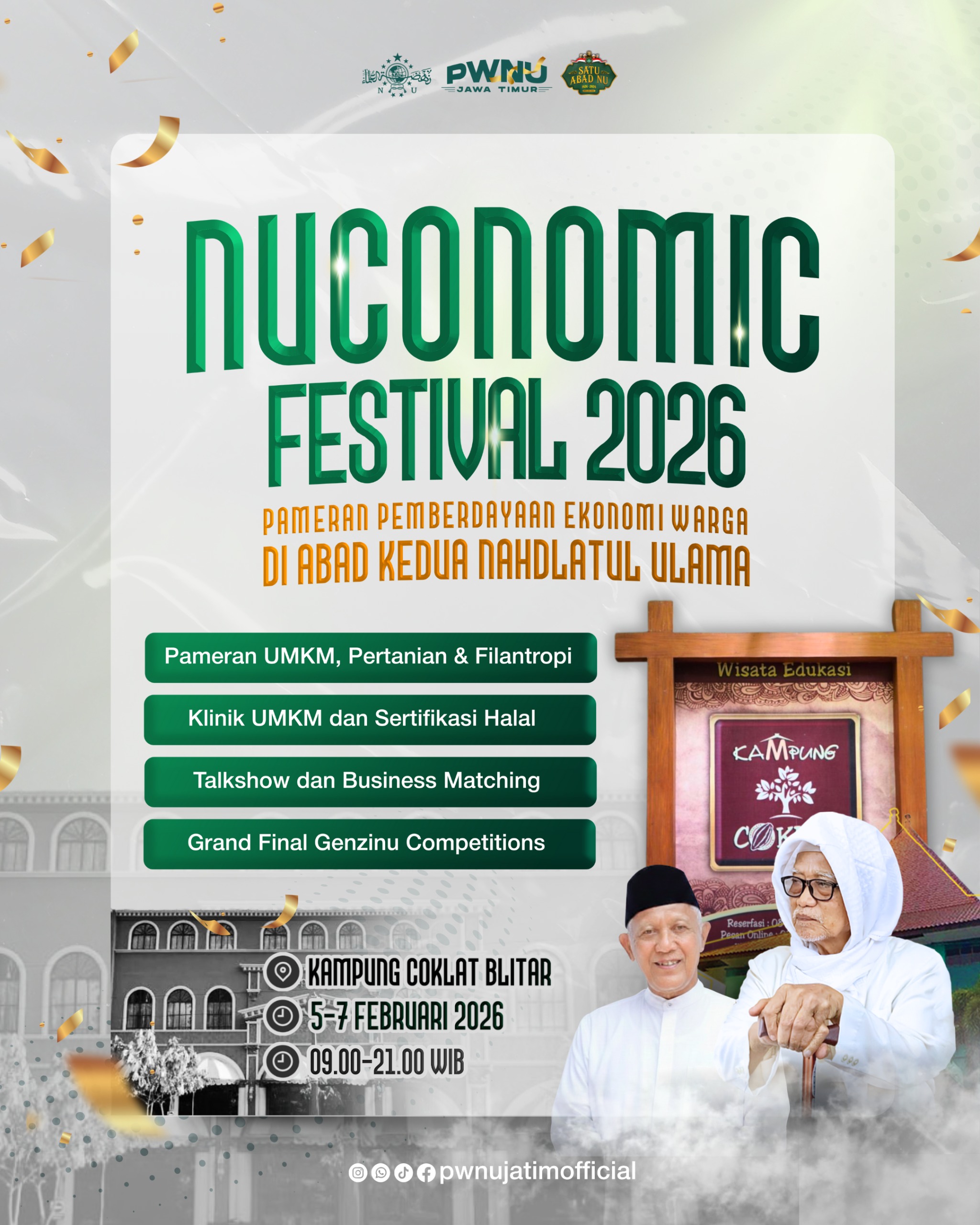 Blitar, jurnal9.tv -Memperingati 1 Abad NU versi Masihiyah, PWNU Jawa Timur menyelenggarakan NUCONOMIC Festival 2026 di Kampung Coklat, Blitar pada tanggal 5-7 Februari 2026. Kegiatan ini merupakan bentuk nyata kehadiran NU dalam kehidupan warganya, khususnya bidang ekonomi. Terdapat ekosistem ekonomi NU yang dibangun melalui pemberdayaan UMKM, Filantropi dan Pertanian.