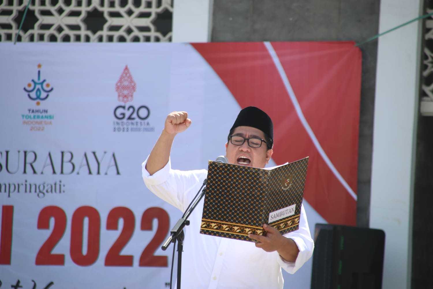 Sebagai inspektur upara, Prof. Dr. Ahmad Zainul Hamdi, M.Ag., Wakil Rektor III, membacakan naskah sambutan Hari Santri Menteri Agama Republik Indonesia, Yaqut Cholil Qoumas. Di dalamnya dinyatakan bahwa santri sejak sebelum kemerdekaan hingga saat ini telah berperan penting dalam menjaga dan merawat NKRI. Saat ini, santri bukan hanya ahli di bidang ilmu agama, tapi juga memiliki kecakapan professional di berbagai bidang.