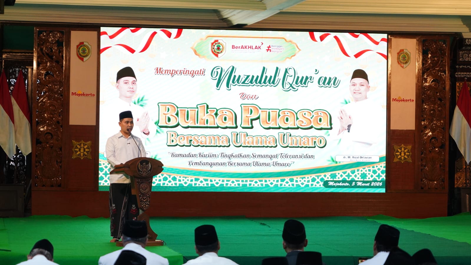 Mojokerto, jurnal9.tv – Dalam rangka memperingati Nuzulul Quran Ramadhan 1447 Hijriah, Pemerintah Kabupaten Mojokerto menggelar buka puasa bersama antara Ulama dan Umara Kabupaten Mojokerto. Giat yang dilaksanakan di Pendopo Graha Maja Tama itu diikuti oleh para Ulama dan para Umara (Jajaran Kepemerintahan) Kabupaten Mojokerto.