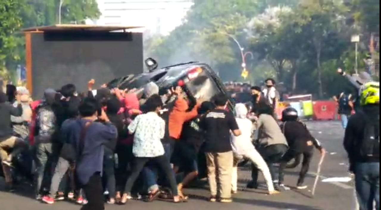 SURABAYA, JURNAL9.tv- Aksi unjuk rasa menolak UU Cipta Kerja (Omnibus Law) di beberapa daerah diwarnai aksi anarkis. Di Surabaya, polisi mengamankan 634 pengunjuk rasa yang merusak fasilitas umum dan melawan petugas.