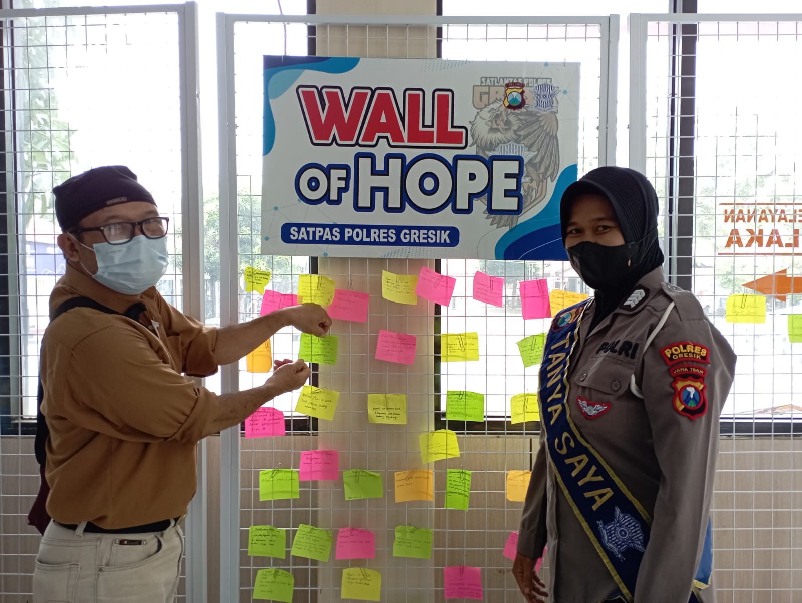 “Wall of Hope bertujuan untuk meningkatkan kualitas pelayanan yang lebih baik terhadap masyarakat yang berkaitan dengan pembuatan atau perpanjangan SIM dan lain sebagainya. Agar mempermudah masyarakat untuk memberikan saran dan masukan terhadap pelayanan SIM di Satpas Satlantas Polres Gresik dan kantor Samsat sehingga dapat digunakan sebagai acuan untuk meningkatkan kualitas pelayanan,” pungkas Agung.